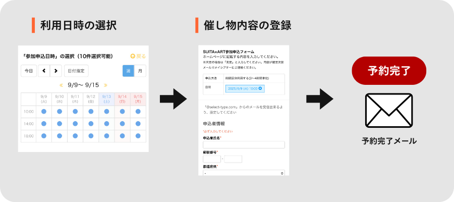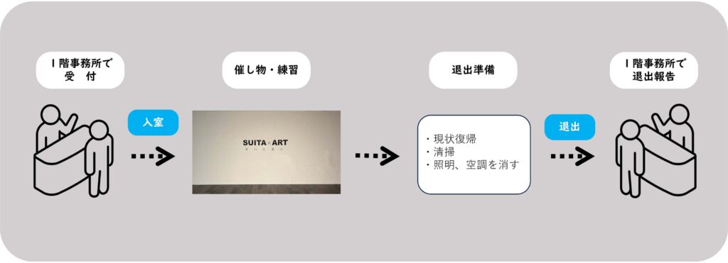 メイシアターについて 自主事業のご紹介 SUITA×ART SUITA×ARTについて ご利用についてのFAQ 参加申込について 参加申し込みの流れ 参加申し込み 当日の流れ 参加申し込みの流れ SUITA×ART参加申込の詳細な手順は下記のPDFよりご確認いただけます。 参加申込マニュアル 参加申し込み 下記ボタンより参加申し込みいただけます。 参加申し込みはこちら 当日の流れ SUITA×ARTについて ご利用についてのFAQ 参加申込み方法 メイシアターについて 自主事業のご紹介