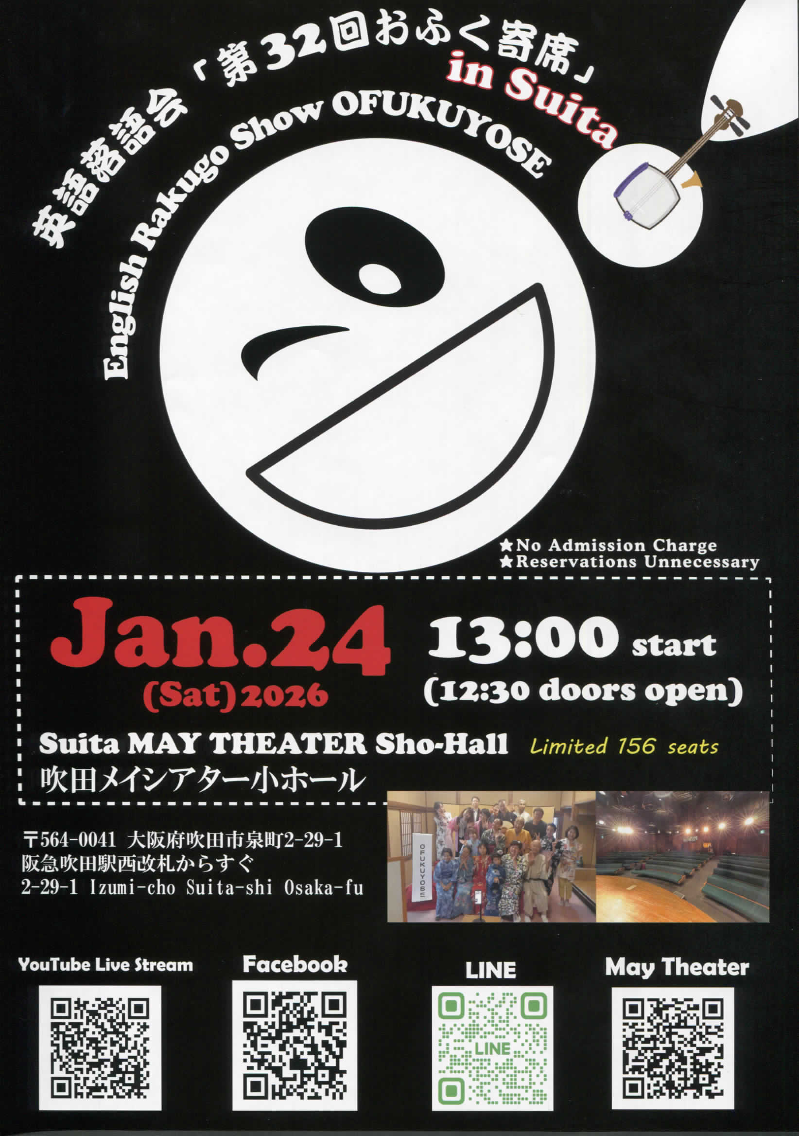 第32回英語落語会おふく寄席 2025.12.17 第32回英語落語会おふく寄席日時2026年1月24日(土)13:00開演場所小ホール入場料無料主催英語落語会おふく寄席お問い合わせ先ofukuyose@gmail.comチラシPDFダウンロード URL Copied!