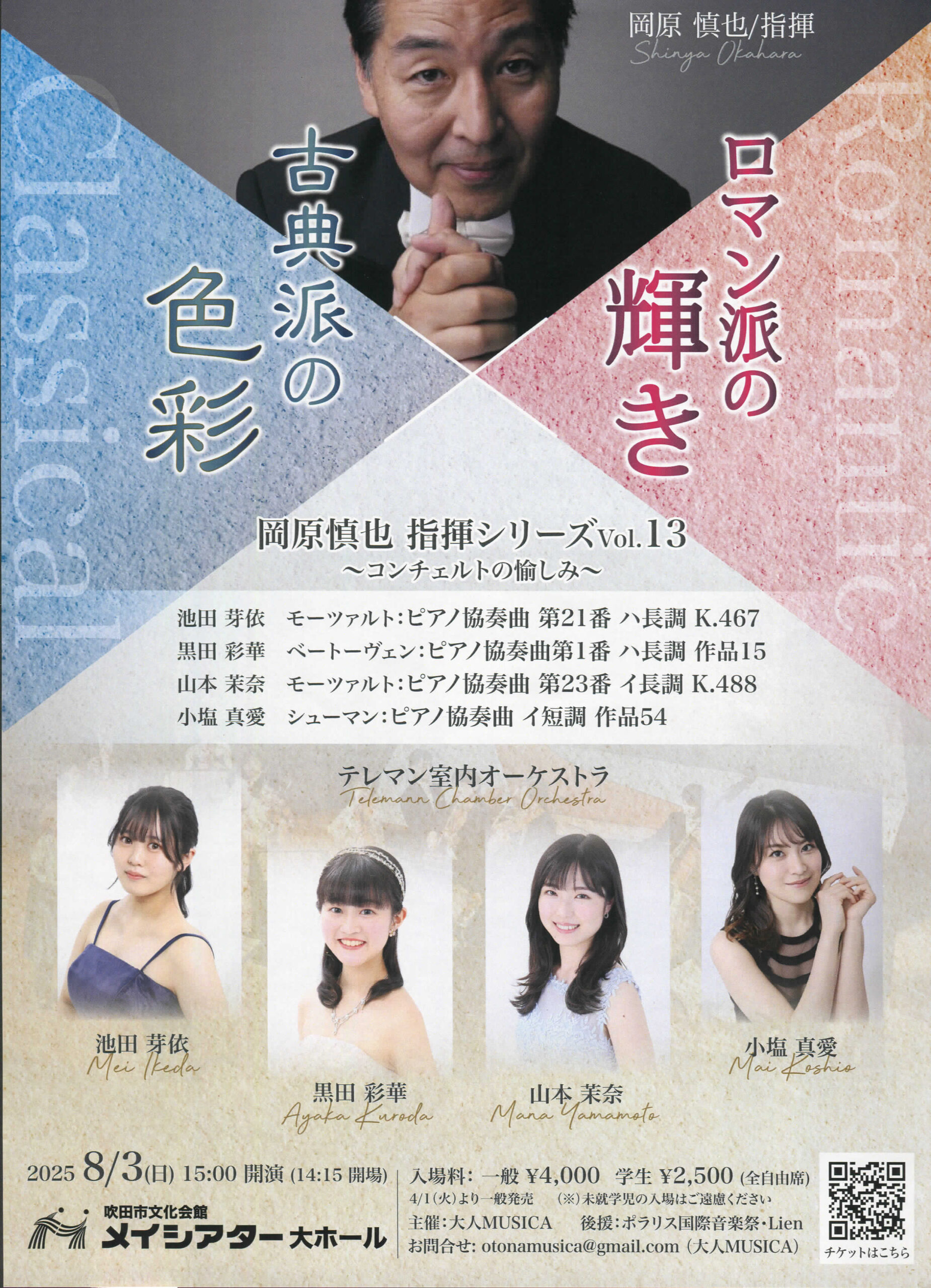~コンチェルトの愉しみ~「古典派の色彩 ロマン派の輝き」 2025.06.18 岡原慎也指揮シリーズVol.13~コンチェルトの愉しみ~「古典派の色彩 ロマン派の輝き」日時2025年08月03日(日) 15:00場所メイシアター 大ホール入場料一般4000円 学生2500円主催大人MUSICAお問い合わせ先otonamusica@gmail.comチラシPDFダウンロード URL Copied!
