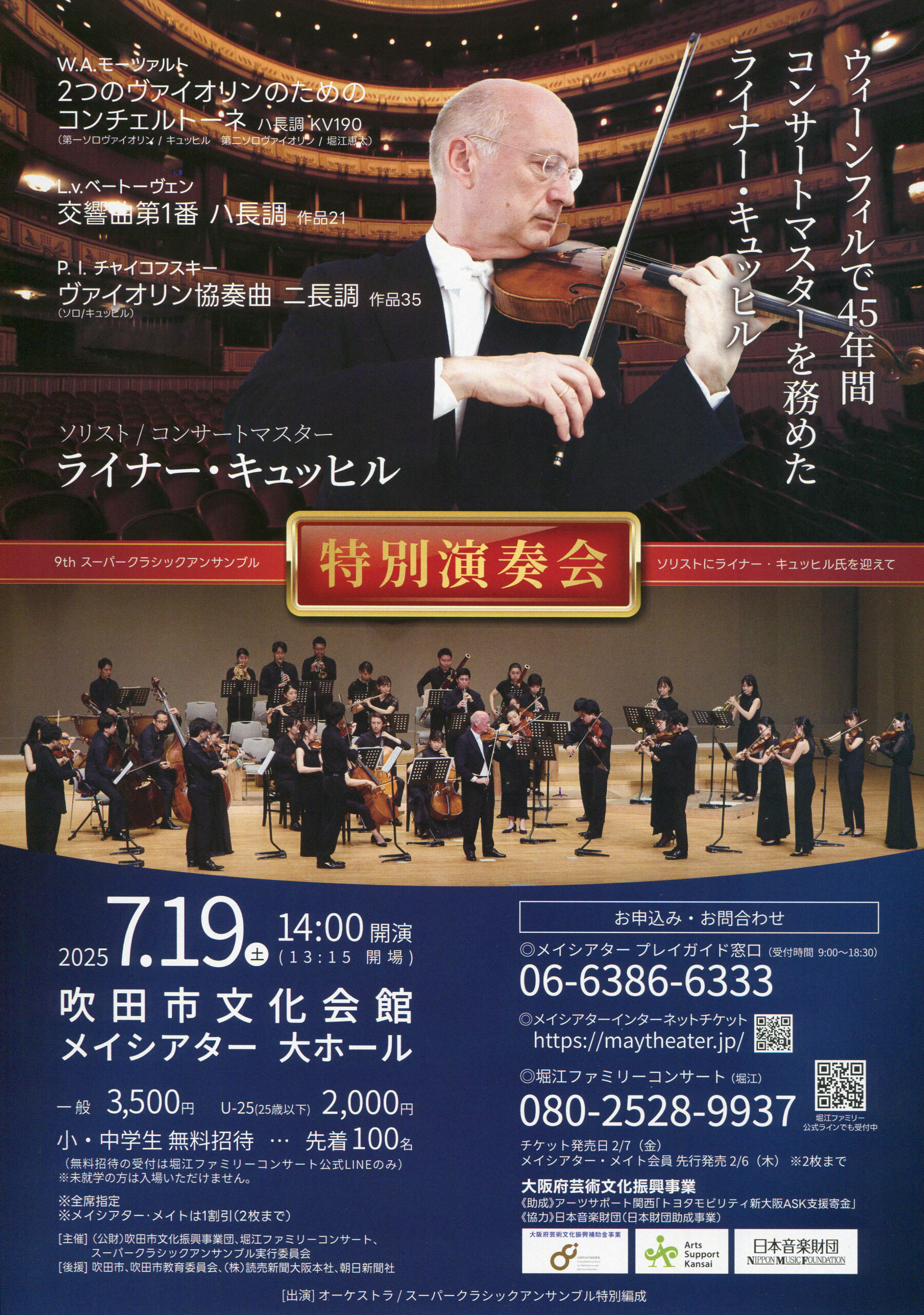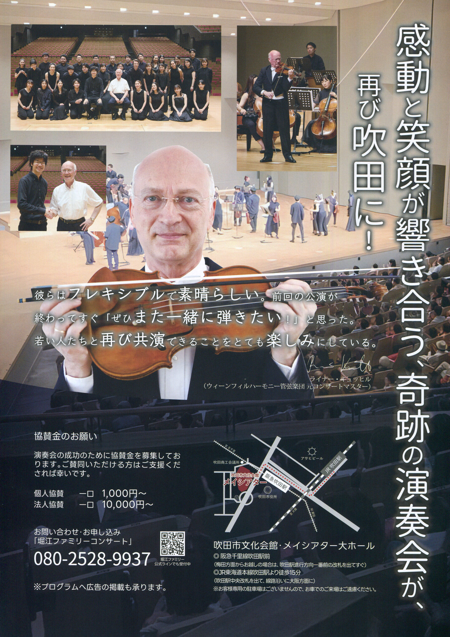 吹田在住のヴァイオリニスト堀江恵太をはじめ、関西の才能あふれた若い弦楽器奏者たちで編成された「スーパークラシックアンサンブル」が、ウィーン・フィルハーモニー管弦楽団の元コンサートマスターとして多くの巨匠たちとウィーンフィルの音楽の歴史を作り上げてきた、ライナー・キュッヒルと夢の共演!