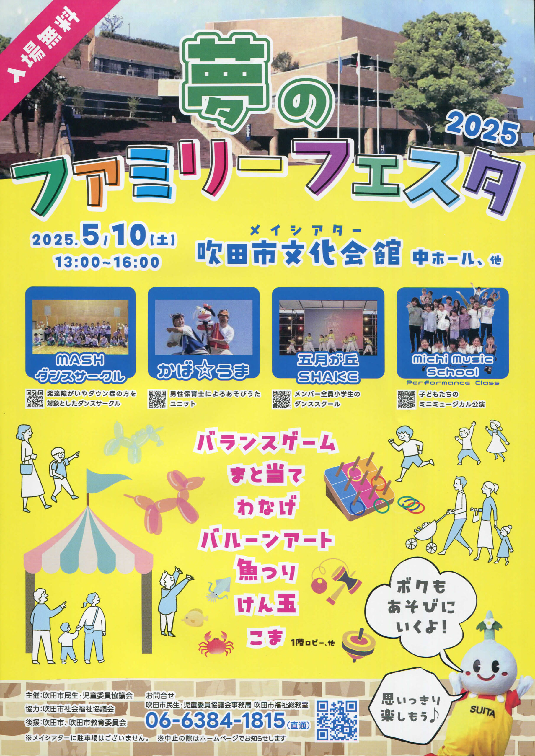 夢のファミリーフェスタ2025 2025.04.232025.05.10 夢のファミリーフェスタ2025日時2025年5月10日(土)13:00開演場所中ホール 他入場料無料お問い合わせ先福祉総務室 06-6384-1815チラシPDFダウンロード URL Copied!