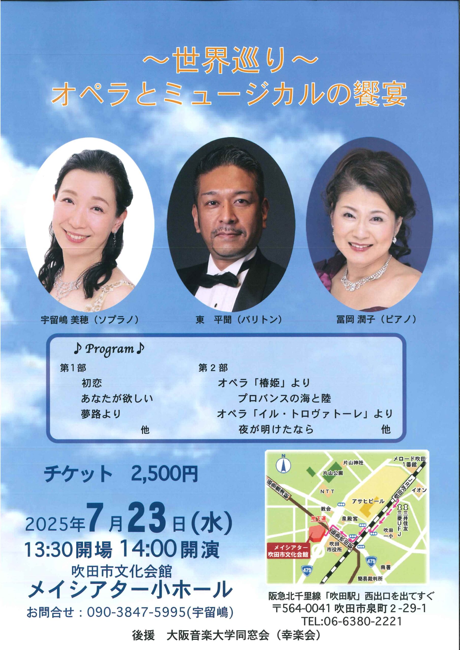~世界巡り~オペラとミュージカルの饗宴 2025.05.27 ~世界巡り~オペラとミュージカルの饗宴日時2025年8月23日(日)14:00開演場所メイシアター小ホール入場料2,500円お問い合わせ先090-3847-5995(宇留嶋)チラシPDFダウンロード URL Copied!