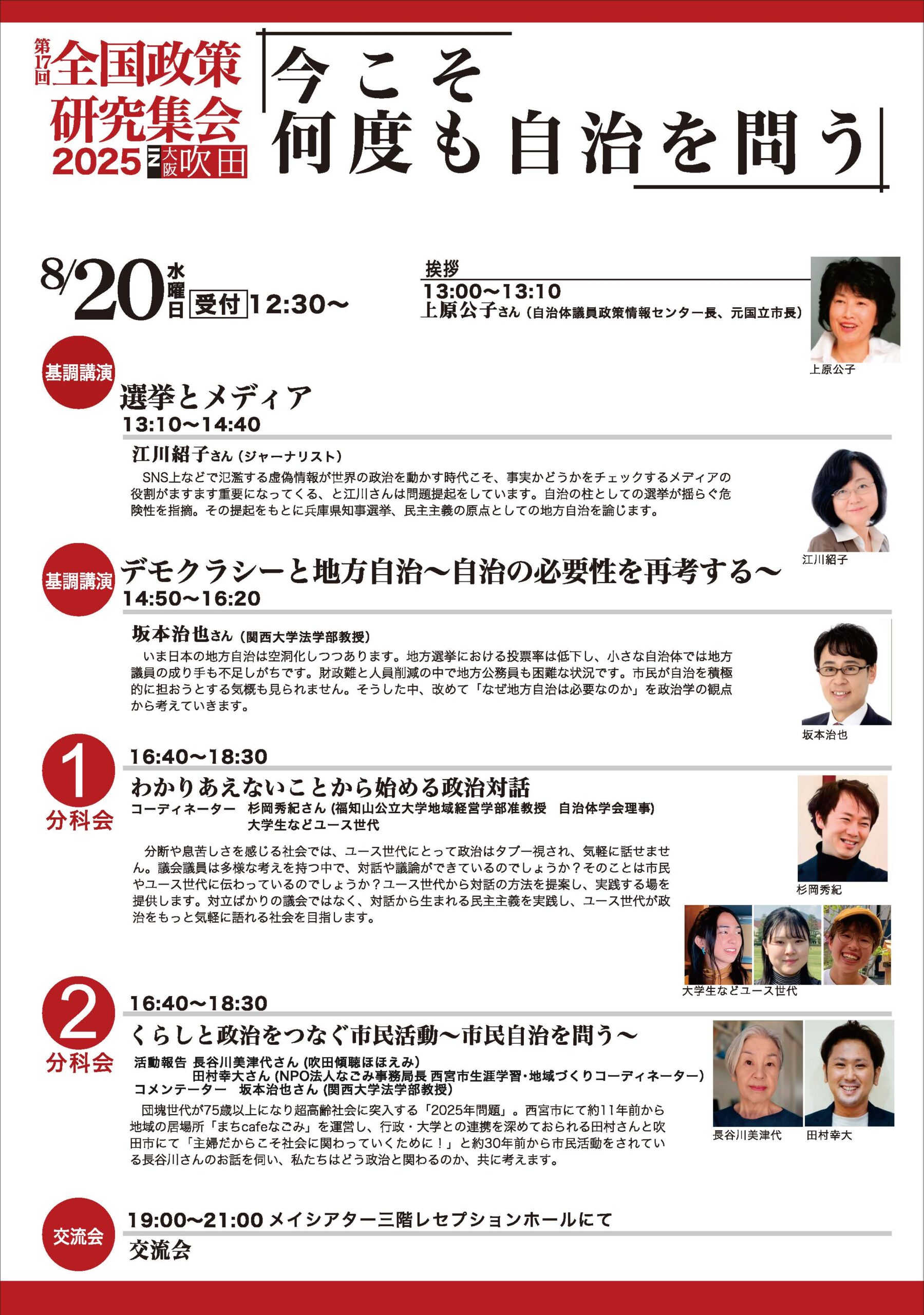 団塊世代が75歳以上になり超高齢社会に突入する「2025年問題」。西宮市にて約11年前から地域の居場所「まちcafeなごみ」を運営し、行政・大学との連携を深めておられる田村さんと吹田市にて「主婦だからこそ社会に関わっていくために!」と約30年前から市民活動をされている長谷川さんのお話を伺い、私たちはどう政治と関わるのか、共に考えます。