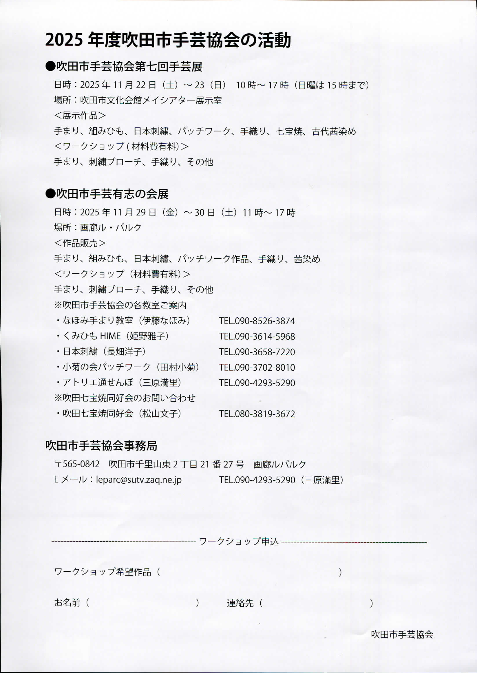 七宝焼作品展示会・第7回手芸展合同展 2025.10.082025.11.15 吹田市民文化祭七宝焼作品展示会・第7回手芸展合同展日時2025年11月22日(土)10:00~17:00/23日(日)10:00~15:00場所展示室入場料無料主催吹田市/吹田市文化団体協議会/吹田七宝焼同好会/吹田市手芸協会お問い合わせ先吹田七宝焼同好会 松山:06-6876-4302 吹田市手芸協会 三原:06-6387-9499チラシPDFダウンロード URL Copied!