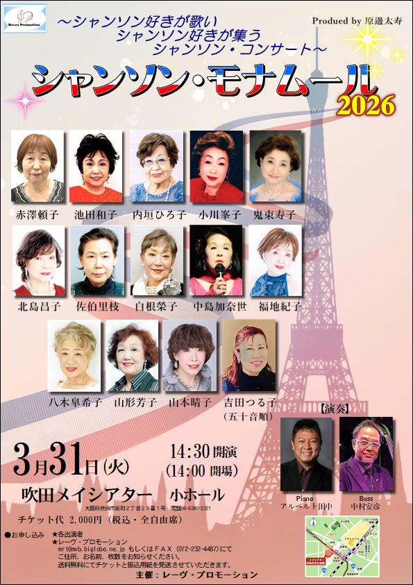 シャンソン・モナムール2026 2026.02.06 〜シャンソン好きが歌いシャンソン好きが集うシャンソン・コンサート〜シャンソン・モナムール2026日時2026年3月31日(火)14:30開演場所小ホール入場料2,000円(全自由席)主催レーヴ・プロモーションお問い合わせ先mail:mrt@mvb.bigobe.ne.jp FAX:072-232-4487 URL Copied!