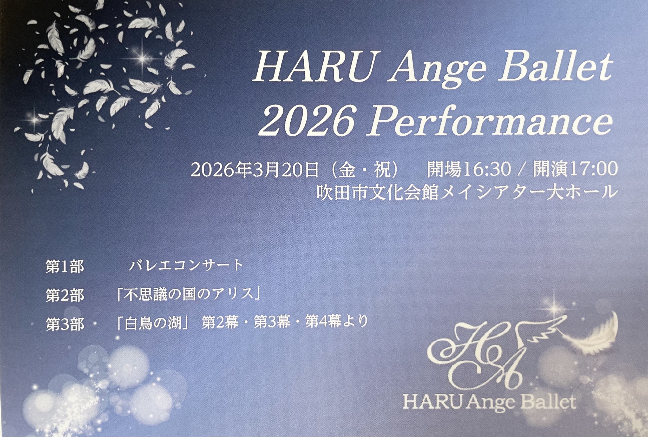 ハルアンジェバレエPerformance2026 2026.02.19 ハルアンジェバレエPerformance2026日時2026年3月20日(金)17:00開演場所大ホール入場料無料 主催ハルアンジェバレエお問い合わせ先西田晴美:haruangeballet@yahoo.co.jp ハルアンジェバレエ公式サイト URL Copied!