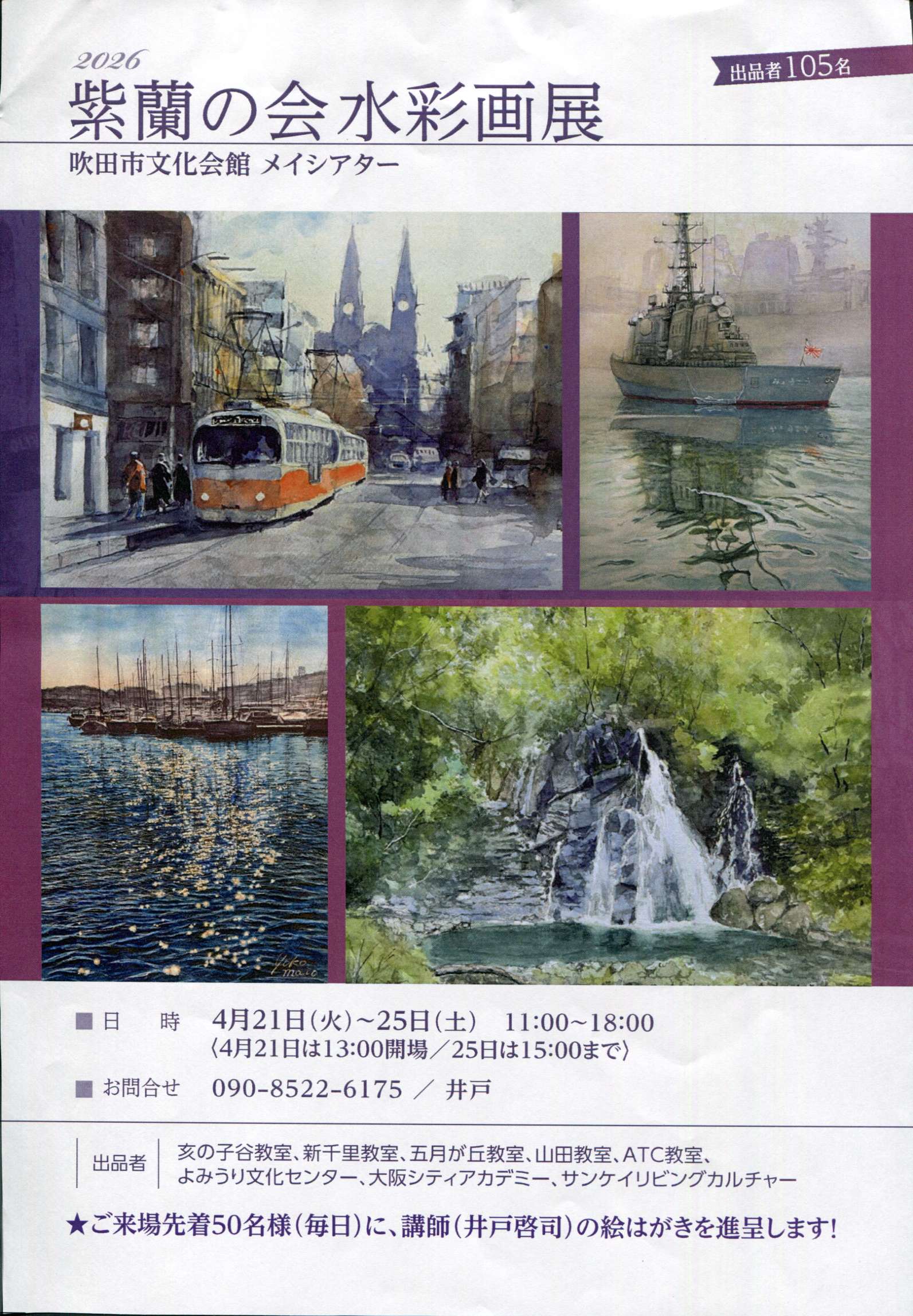 紫蘭の会水彩画展 2026.02.25 紫蘭の会水彩画展日時2026年04月21日(火)13:00~18:00/04月22日(水)~24日(金)11:00~18:00/04月25日(土)11:00~15:00場所展示室入場料無料主催紫蘭の会お問い合わせ先伴 正和…080-3861-5736 URL Copied!